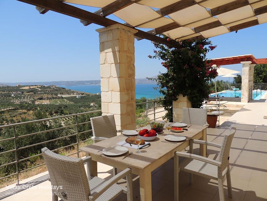 Die aufmerksamen Eigentümer, eine griechisch-amerikanische Familie, die in Singapur lebt, haben die Villa Azure so gestaltet, dass sie moderne Einrichtungen und Komfort mit traditionellen kretischen Baumaterialien wie lokalem Zypressenholz für die hohe gewölbte Wohnzimmerdecke und die Außenpergolen, Marmor für die Poolbar, den Kamin und die Fensterbänke und den schönen cremefarbenen Stein aus dem nahegelegenen Dorf Gavalohori vereint, der für den Küchenbogen, die Säulen, den Grillbereich, die Begrenzungsmauern und das Steinpflaster verwendet wurde. Der Hauptwohnbereich der Villa hat einen modernen und attraktiven offenen Grundriss, der im Sommer kühl bleibt und die Meeresbrise und die wunderbare Aussicht auf das Meer und die Berge voll ausnutzt. Die Villa Azure vermittelt das komfortable Gefühl eines gut ausgestatteten und sehr geräumigen Hauses. Um jedem Gast absolute Ruhe und Privatsphäre zu gewährleisten, hat keines der Schlafzimmer eine angrenzende Wand, aber jedes Schlafzimmer verfügt über ein eigenes, vollständig gefliestes Duschbad und eine Klimaanlage. Für die kühleren Nächte zu Beginn und Ende der Saison dienen die Klimaanlagen auch als Heizungen und es gibt eine Fußbodenheizung und einen Kamin.